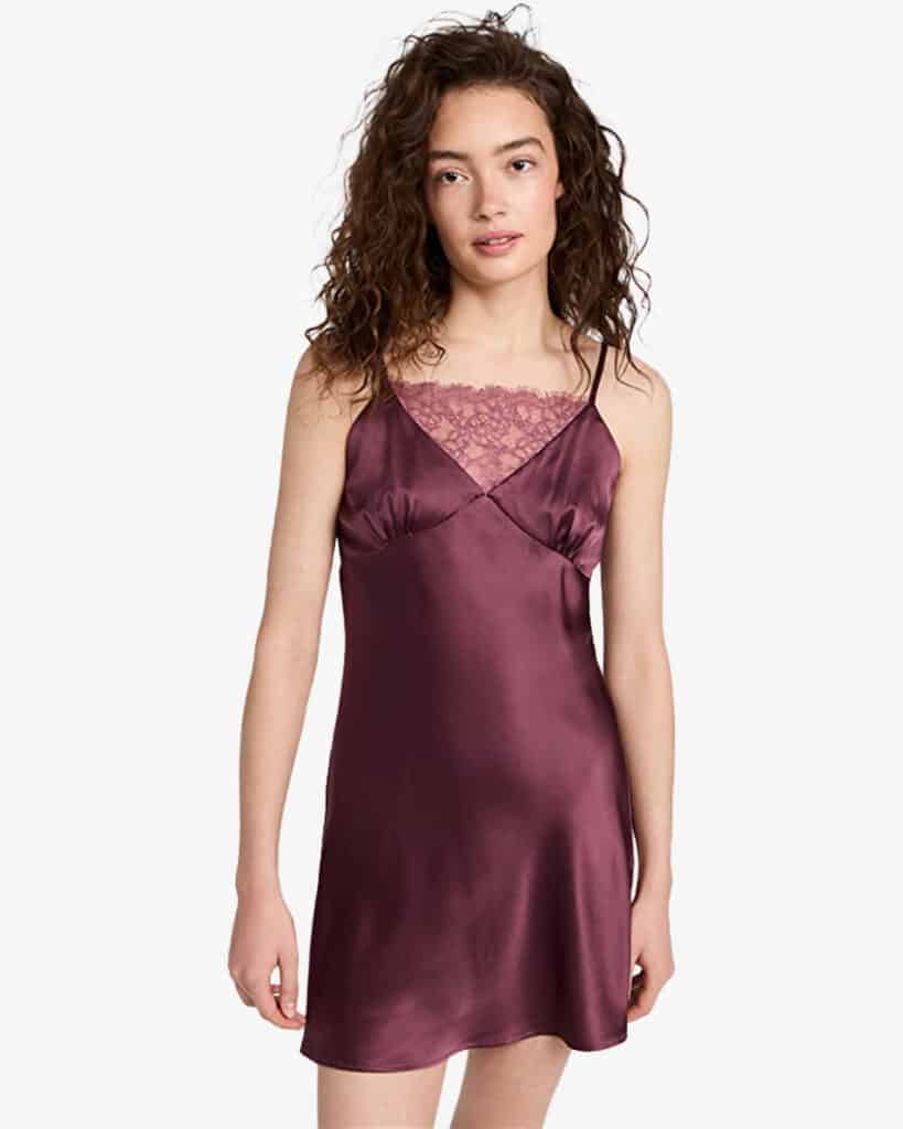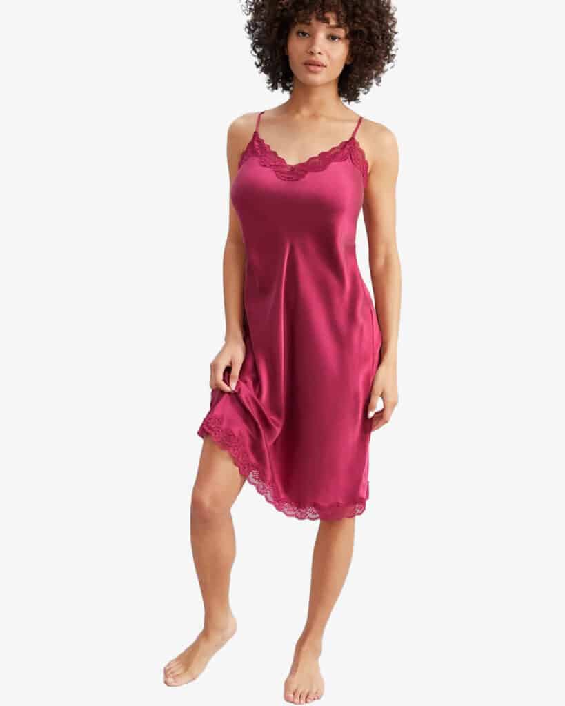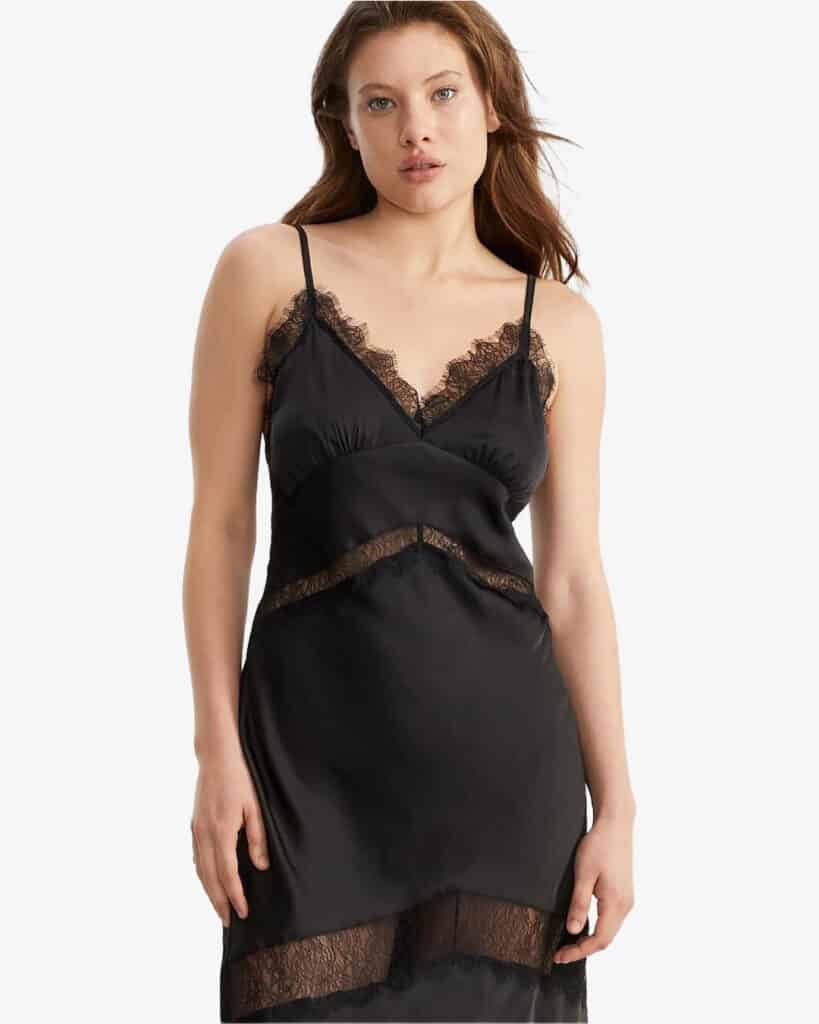 This slip dress has a unique design detail – it has a lace trim covering your décolleté. How will this work under dresses? Choose a dress with a v-neck, and let the lace show from underneath. It will add texture and femininity to your look.