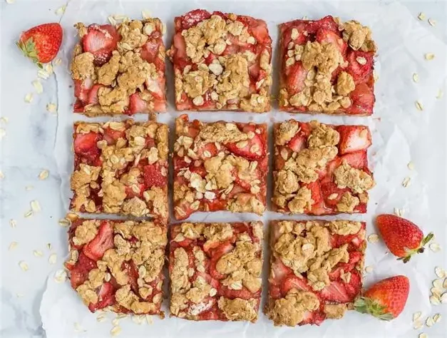 These oatmeal bars are a wholesome snack or breakfast option, featuring a sweet strawberry filling.