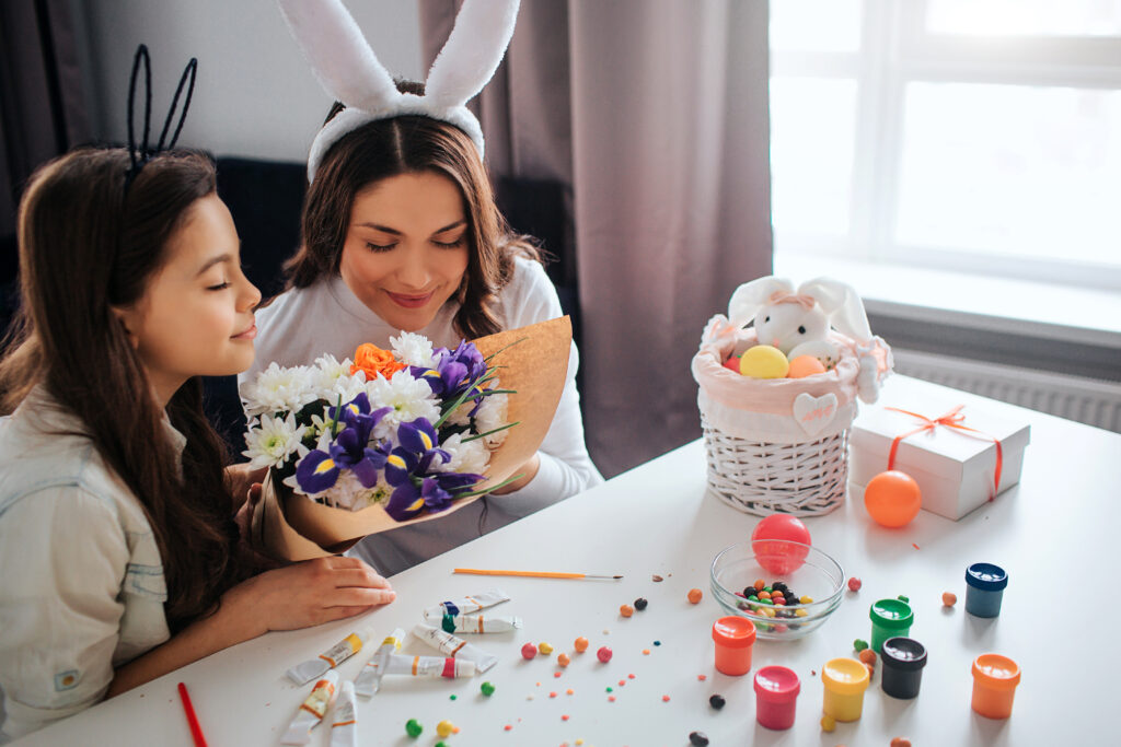 A spring-themed pillowcase is soft, easy to fill, and surprisingly cute when tied with ribbon at the top. It also turns into something useful instead of one more container sitting around.