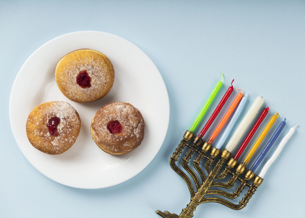 These deep-fried donuts, filled with jam and dusted with powdered sugar, are a Hanukkah favorite. Their round shape and sweet filling symbolize the miracle of the oil.