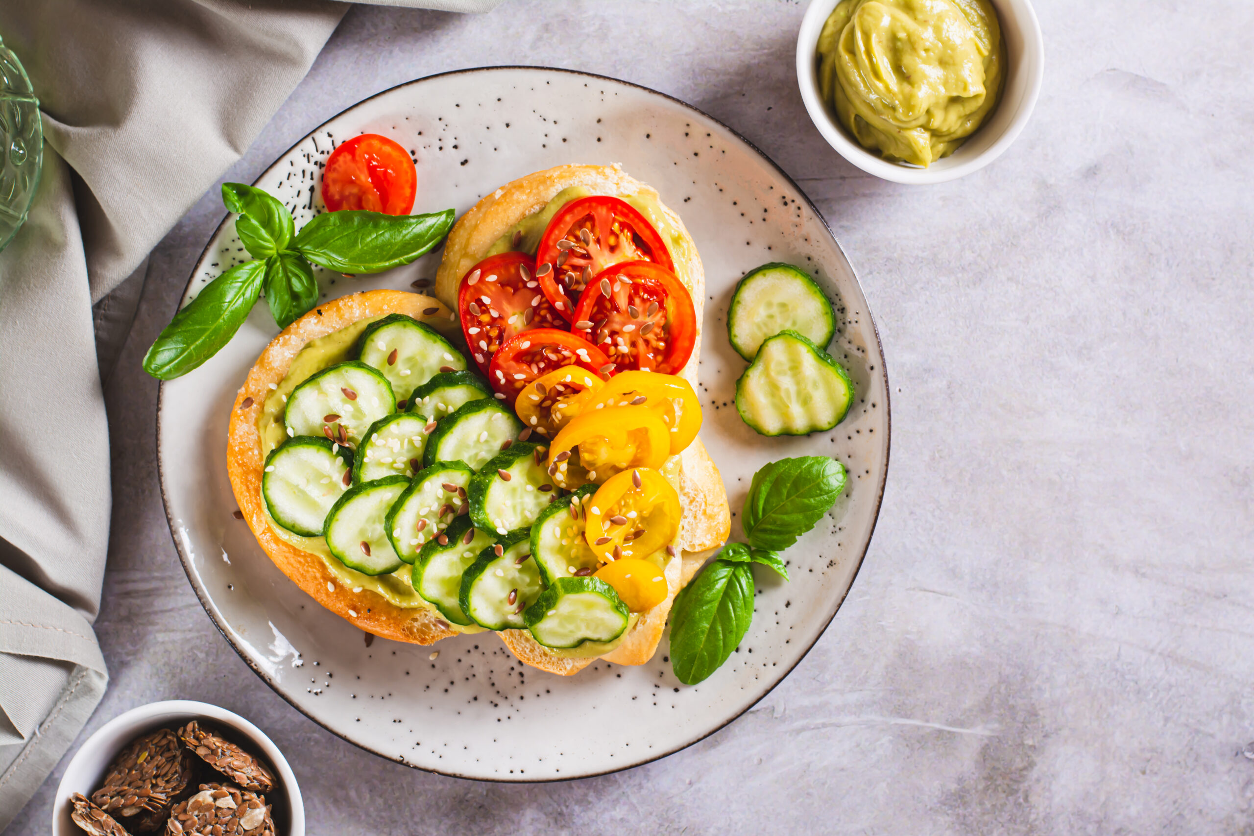 Ingredients: Whole grain bread, ripe avocado, lime juice, salt, pepper, red pepper flakes, cherry tomatoes, fresh basil.
